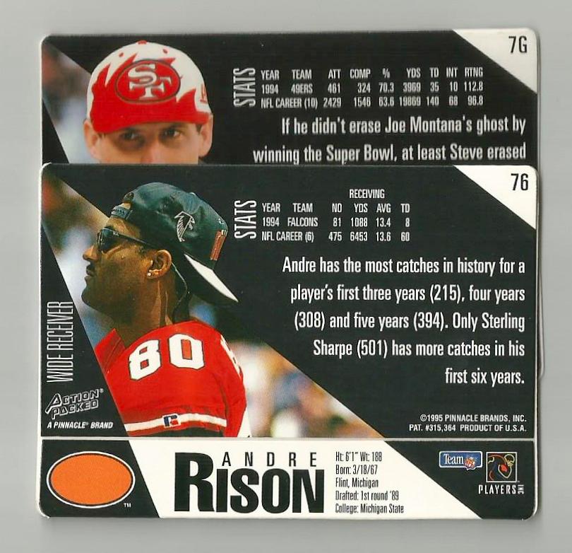 The back of the Rookie Cards feature sort of a spotlight design on the players photo, the players college statistics are up above with a little bit of information about the player. On this card, Action Packed wants you to know that J.J. Stokes "doesn't win races ---just games"....well someone tell that to the 49ers!